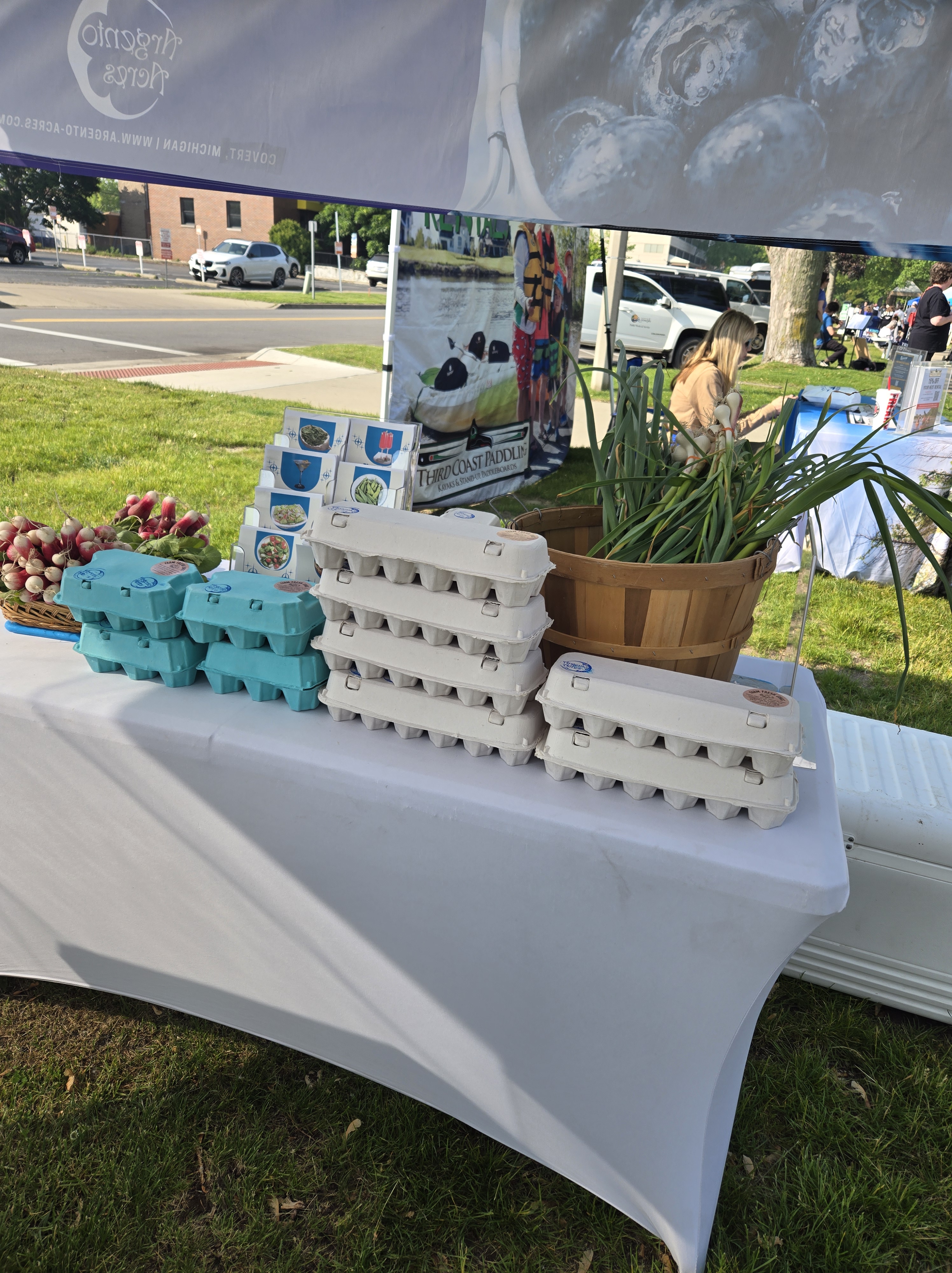 Founded in 2020, Argento Acres is a women-owned, sustainably run farm in Coloma, MI. For the first few years, it was located on 14.5 acres in Covert, MI with 4 acres of blueberries, a hoop house, and a market garden with fresh produce including tomatoes, peppers, cucumbers, garlic, onions, ginger, turmeric, herbs, and greens.