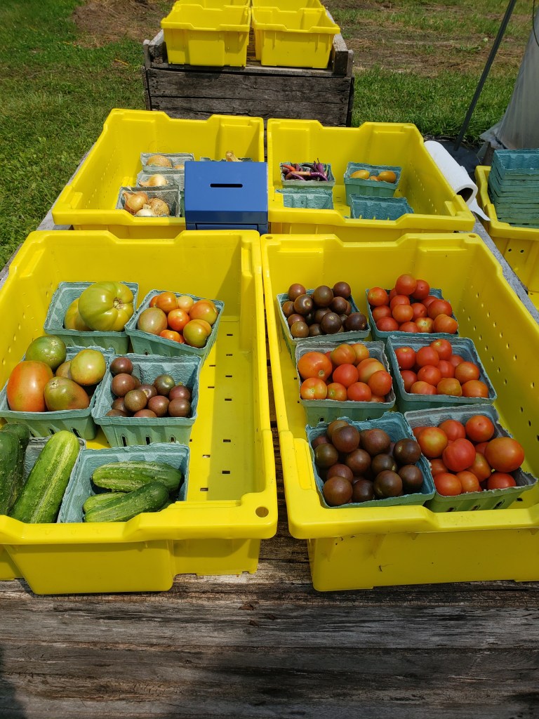 July: blueberries, salad mix, head lettuce, broccoli, cauliflower, tomatoes, peppers, garlic, onions, kale, beets, hakurei salad turnips, daikon radish, carrots, herbs