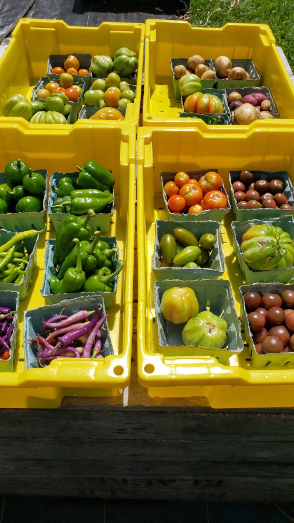 August: blueberries, broccoli, cauliflower, kale, cucumbers, tomatoes, peppers, summer squash, green beans, garlic, onions, fingerling potatoes, herbs, cabbage, edible flowers, flower bouquets