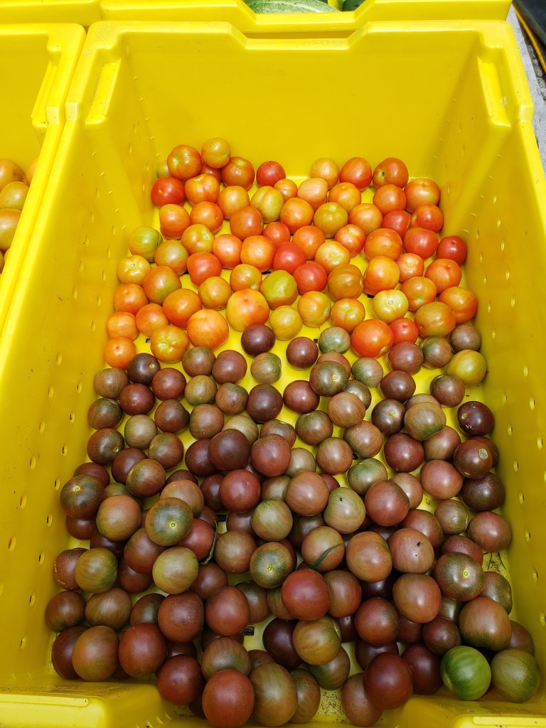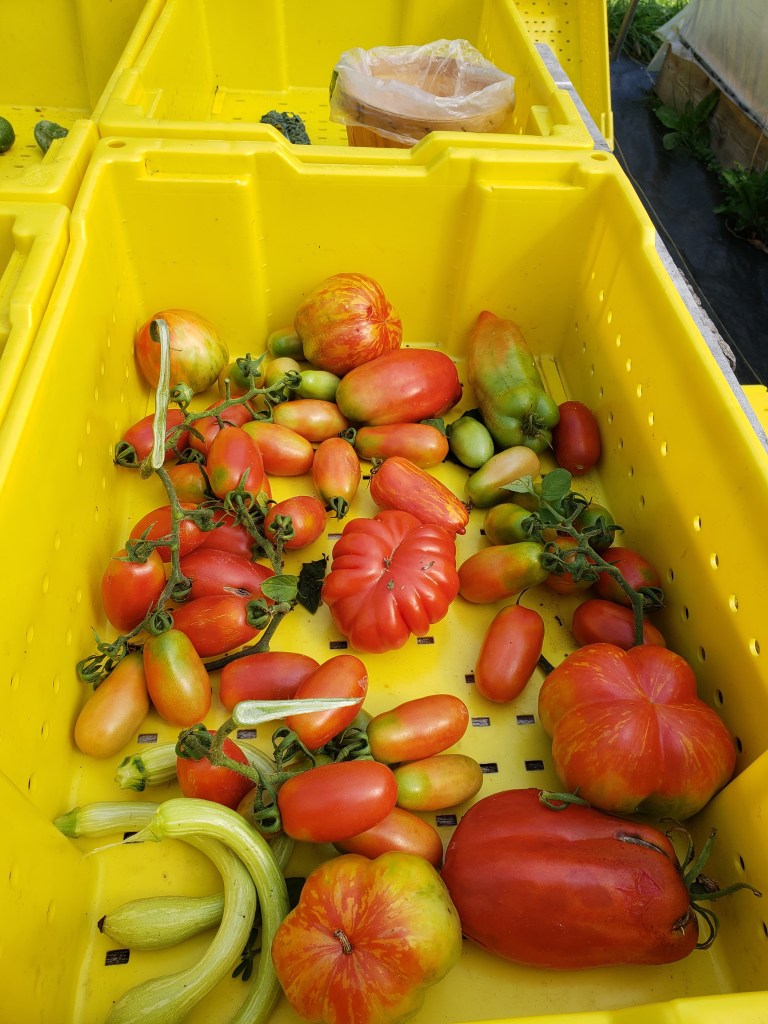 October: salad mix, head lettuce, tomatoes, peppers, broccoli, cauliflower, kale, green beans, garlic, onions, herbs, cabbage, winter squash/pumpkins, ginger/turmeric, sweet potatoes, flower bouquets