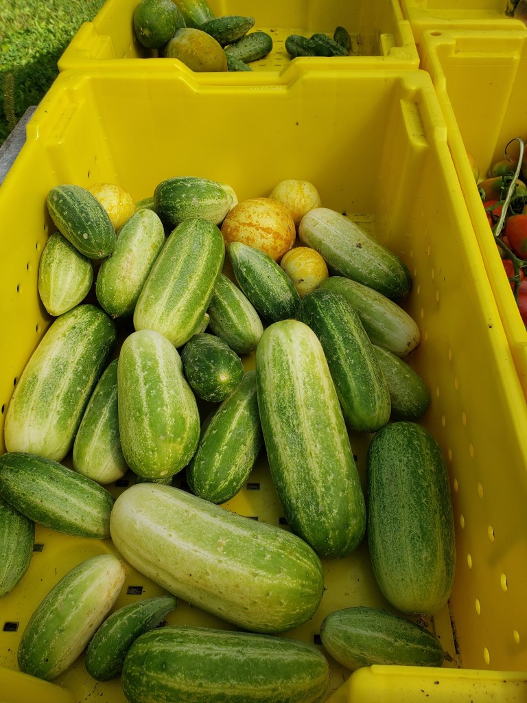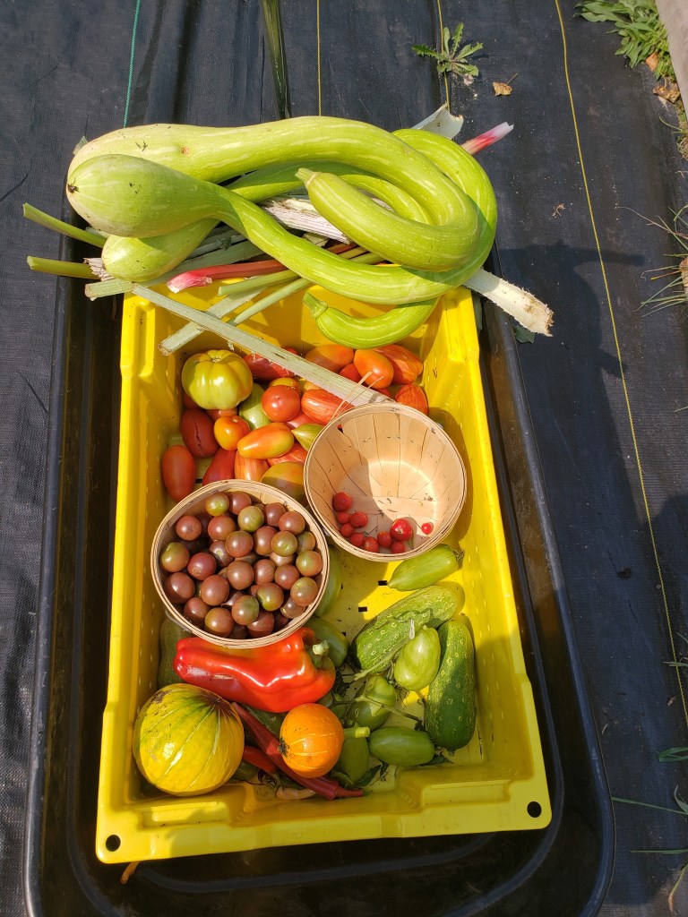 September: salad mix, head lettuce, broccoli, cauliflower, kale, cucumbers, tomatoes, peppers, summer squash, green beans, garlic, onions, fingerling potatoes, herbs, cabbage, edible flowers, winter squash/pumpkins, flower bouquets